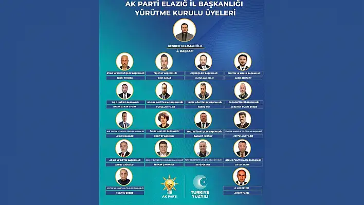 AK Parti Elazığ İl Başkanı Sencer Selmanoğlu başkanlığında oluşturulan yeni Yürütme Kurulu üyeleri açıklandı. Yapılan görevlendirme ile teşkilatın vitrini ve çalışma ekibi şu isimlerden oluştu: