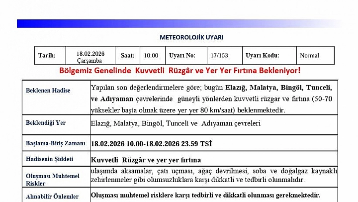Meteoroloji 13. Bölge Müdürlüğü'nden yapılan uyarıda, 'Yapılan son değerlendirmelere göre; bugün Elazığ, Malatya, Bingöl, Tunceli, ve Adıyaman çevrelerinde güneyli yönlerden kuvvetli rüzgar ve fırtına (50-70 yüksekler başta olmak üzere yer yer 80 km/saat) beklenmektedir. Ulaşımda aksamalar, çatı uçması, ağaç devrilmesi, soba ve doğalgaz kaynaklı zehirlenmeler gibi olumsuzluklara karşı dikkatli ve tedbirli olunmalıdır' denildi.