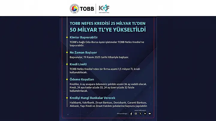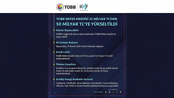 'Odamıza kayıtlı KOBİ üyelerimiz 2 Ekim 2025 tarihinden itibaren kredi başvurusu yapan Kobiler, Nefes Kredisi kapsamında bir firmanın azami 1,5 milyon TL'ye kadar kredi kullanabileceğini, kredi hacminin toplam büyüklüğü ise 25 milyar TL'den 50 milyar TL'ye yükseltildiği açıklandı.