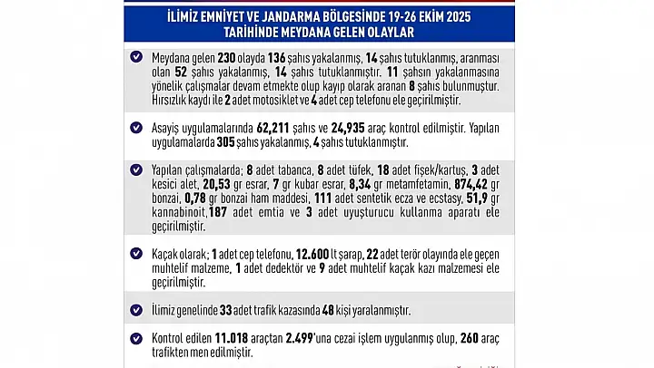 Elazığ Valiliği, 12-19 Ekim 2025 tarihleri arasındaki haftalık asayiş verilerini açıkladı. Kent genelinde meydana gelen 230 olayda 136 şüpheli yakalanırken, 14 kişi tutuklandı. Aranması olan 52 şahısta yakalanırken 14'ü tutuklandı. Çalışmalarda 62 bin 211 şahıs ve 24 bin 935 araç denetlenirken uygulamalarda 305 şahsın yakalandığı ve 4'ünün tutuklandığı bildirildi. Kontrol edilen araçlardan, 2 bin 499'une cezai işlem uygulanırken 260 araç da trafikten men edildi. Kent genelinde meydana gelen 33 adet trafik kazasında 48 kişinin yaralandığı aktarıldı.