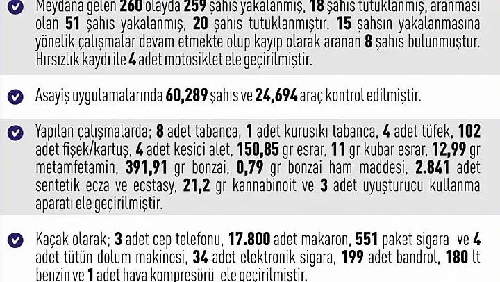 Yapılan çalışmalarda; 8 adet tabanca, 1 adet kurusıkı tabanca, 4 adet tüfek, 102 adet fişek/kartuş, 4 adet kesici alet, 150,85 gram esrar, 11 gram kubar esrar, 12,99 gram metamfetamin, 391,91 gram bonzai, 0,79 gram bonzai ham maddesi, 2.841 adet sentetik ecza ve ecstasy, 21,2 gr kannabinoit ve 3 adet uyuşturucu kullanma aparatı, kaçak olarak; 3 adet cep telefonu, 17 bin 800 adet makaron, 551 paket sigara ve 4 adet tütün dolum makinesi, 34 adet elektronik sigara, 199 adet bandrol, 180 litre benzin ve 1 adet hava kompresörü ele geçirildi.