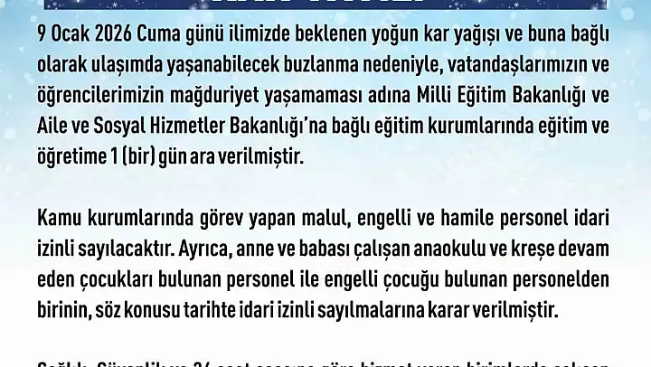 Elazığ Valiliğinden yapılan açıklamada, '9 Ocak 2026 Cuma günü ilimizde beklenen yoğun kar yağışı ve buna bağlı olarak ulaşımda yaşanabilecek buzlanma nedeniyle, vatandaşlarımızın ve öğrencilerimizin mağduriyet yaşamaması adına Milli Eğitim Bakanlığı ve Aile ve Sosyal Hizmetler Bakanlığı'na bağlı eğitim kurumlarında eğitim ve öğretime 1 gün ara verilmiştir. Kamu kurumlarında görev yapan malul, engelli ve hamile personel idari izinli sayılacaktır. Ayrıca, anne ve babası çalışan anaokulu ve kreşe devam eden çocukları bulunan personel ile engelli çocuğu bulunan personelden birinin, söz konusu tarihte idari izinli sayılmalarına karar verilmiştir. Ayrıca, sağlık, güvenlik ve 24 saat esasına göre hizmet veren birimlerde çalışan personellerin durumu hizmetin gereği olarak ilgili birimler tarafından değerlendirilecektir' ifadelerine yer verildi.