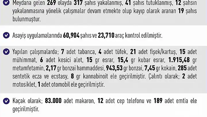 Yapılan çalışmalarda, 7 adet tabanca, 4 adet tüfek, 21 adet fişek/kartuş, 15 adet mühimmat, 6 adet kesici alet, 15 gram esrar, 15,4 gram kubar esrar, bin 915,48 gram metamfetamin, 2,17 gram bonzai ham maddesi, 943,53 gram bonzai, 7,45 gram kokain, 285 adet sentetik ecza ve extacy, 8 gram kannabinoit yakalandı. Çalıntı olarak, 2 adet motosiklet, 1 adet otomobil ele geçirilirken kaçak olarak 83 bin adet makaron, 12 adet cep telefonu ve 189 adet emtia ele geçirildi.