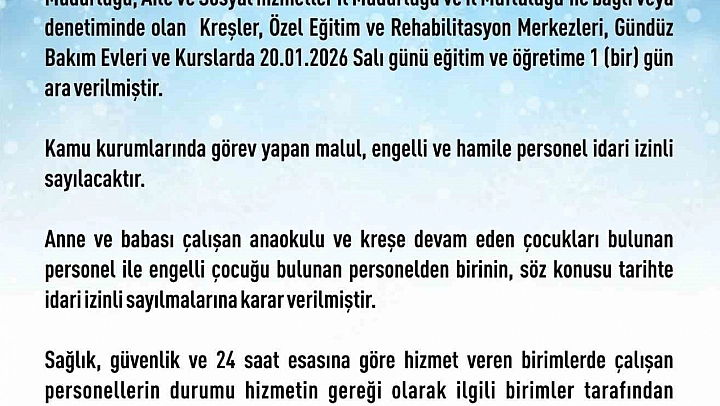 Elazığ Valiliğinden yapılan açıklamada, 'Yoğun kar yağışı ve buzlanma nedeniyle ilimiz merkezinde Milli Eğitim Müdürlüğü, Aile ve Sosyal Hizmetler İl Müdürlüğü ve İl Müftülüğü'ne bağlı veya denetiminde olan kreşler, özel eğitim ve rehabilitasyon merkezleri, gündüz bakım evleri ve kurslarda salı günü eğitim ve öğretime 1 gün ara verilmiştir. Kamu kurumlarında görev yapan malul, engelli ve hamile personel idari izinli sayılacaktır. Anne ve babası çalışan anaokulu ve kreşe devam eden çocukları bulunan personel ile engelli çocuğu bulunan personelden birinin söz konusu tarihte idari izinli sayılmalarına karar verilmiştir. Sağlık, güvenlik ve 24 saat esasına göre hizmet veren birimlerde çalışan personellerin durumu hizmetin gereği olarak ilgili birimler tarafından değerlendirilecektir. İlçelerde ise kaymakamlar tarafından karar verilecektir' denildi.