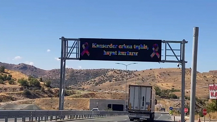 Elazığ'da meme kanserinde erken teşhisin önemine dikkat çekmek amacıyla, Kömürhan Köprüsü pembe renklerle ışıklandırılırken dijital ekranlara sloganlar yerleştirildi.
