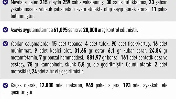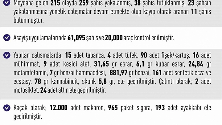 Yapılan çalışmalarda,15 adet tabanca, 4 adet tüfek, 90 adet fişek/kartuş, 16 adet mühimmat, 9 adet kesici alet, 31,65 gram esrar, 6,1 gram kubar esrar, 24,84 gram metamfetamin, 7 gram bonzai hammaddesi, 881,97 gram bonzai, 161 adet sentetik ecza ve ecstasy, 78 gram kannabinoit, skunk 5,8 gram ele geçirildi. Çalıntı olarak, 2 adet motosiklet, 24 adet altın ele geçirildi. Kaçak olarak, 12 bin adet makaron, 965 paket sigara, 193 adet ayakkabı ele geçirildi.
