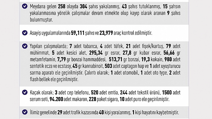 Yapılan çalışmalarda, 7 adet tabanca, 4 adet tüfek, 21 adet fişek/kartuş, 79 adet mühimmat, 5 adet kesici alet, 295,34 gram esrar, 27,8 gram kubar esrar, 56,66 gram metamfetamin, 7,79 gram bonzai hammaddesi, 513,71 gram bonzai, 19,3 kokain, 980 adet sentetik ecza ve ecstasy, 45 gram kannabinoit, 503 adet captagon hap ve 1 adet uyuşturucu sarma aparatı ele geçirilmiştir. Çalıntı olarak; 1 adet otomobil, 1 adet oto type, 2 adet flash bellek ele geçirildi. Kaçak olarak 3 adet cep telefonu, 520 adet emtia, 244 adet tekstil ürünü, bin 500 adet serum seti, 94 bin 200 adet makaron, 228 paket sigara, 10 adet puro ele geçirildi.