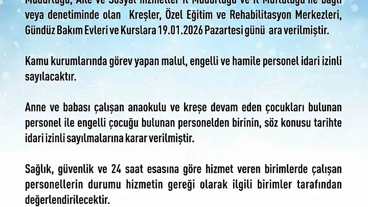 Elazığ Valiliği'nden yapılan açıklamada, 'Yoğun kar yağışı ve buzlanma nedeniyle ilimiz merkezinde Milli Eğitim Müdürlüğü, Aile ve Sosyal hizmetler İl Müdürlüğü ve İl Müftülüğü'ne bağlı veya denetiminde olan kreşler, özel eğitim ve rehabilitasyon merkezleri, gündüz bakım evleri ve kurslara Pazartesi günü ara verilmiştir. Kamu kurumlarında görev yapan malul, engelli ve hamile personel idari izinli sayılacaktır. Anne ve babası çalışan anaokulu ve kreşe devam eden çocukları bulunan personel ile engelli çocuğu bulunan personelden birinin, söz konusu tarihte idari izinli sayılmalarına karar verilmiştir. Sağlık, güvenlik ve 24 saat esasına göre hizmet veren birimlerde çalışan personellerin durumu hizmetin gereği olarak ilgili birimler tarafından değerlendirilecek. İlçelerde ise Kaymakamlar tarafından karar verilecektir' denildi.