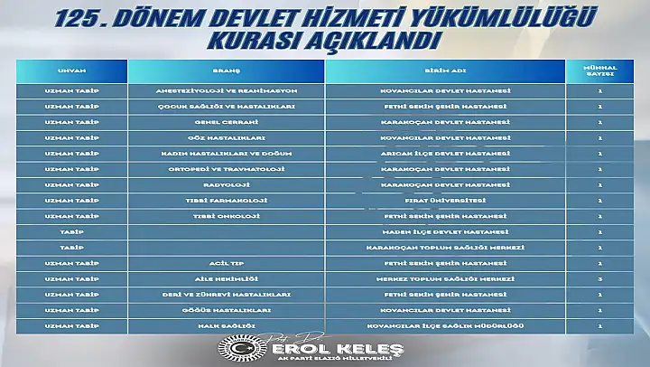 Elazığ, sağlık altyapısını güçlendirecek önemli bir gelişmeyi kamuoyuyla paylaştı. Sağlık Bakanlığı tarafından düzenlenen 125. Dönem Devlet Hizmeti Yükümlülüğü (DHY) Kurası sonuçları açıklandı ve bu kapsamda Elazığ iline yeni hekim kadroları tahsis edildi.