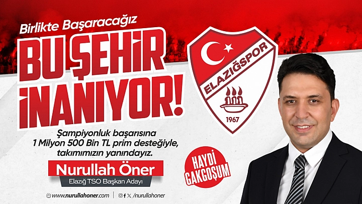 Şampiyonluk mücadelesi veren Elazığspor'a destek büyüyor. Elazığ TSO Başkan Adayı Nurullah Öner, takımın başarısına katkı sağlamak ve motivasyonu artırmak amacıyla 1 milyon 500 bin TL prim desteği vereceğini açıkladı.