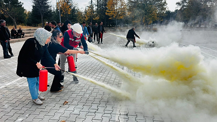 Tatbikat kapsamında, Sivil Savunma Uzmanı Naim Tan tarafından personele yangın tüplerinin nasıl kullanılacağı ve alevlere hangi yönden müdahale edilmesi gerektiği uygulamalı olarak gösterildi.Hiçbir olumsuzluk yaşanmadan tamamlanan tatbikatın ardından, üniversitemizin diğer birimlerinde de önümüzdeki günlerde benzer yangın tatbikatlarının gerçekleştirileceği bildirildi.