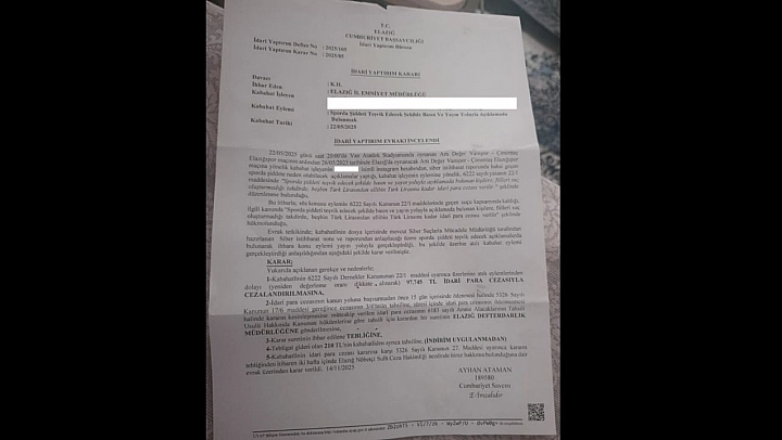 Elazığ Cumhuriyet Başsavcılığı İdari Yaptırım Bürosu'nun tebliğ ettiği kararlarla yaklaşık 100 taraftar, ağır para cezalarıyla karşılaştı. Cezalardan birini paylaşan bir taraftar, sosyal medyada sporda şiddeti teşvik edecek paylaşımlar yaptığı gerekçesiyle 97 bin 745 TL tutarında idari para cezası kesildiğini belirtti. Taraftarlar, hem bu yüksek idari para cezaları hem de devam eden adli davalar nedeniyle günlük yaşamlarını sürdürmekte zorlandıklarını ifade ederek, bu süreçte yalnız bırakıldıklarından şikayetçi oldu.