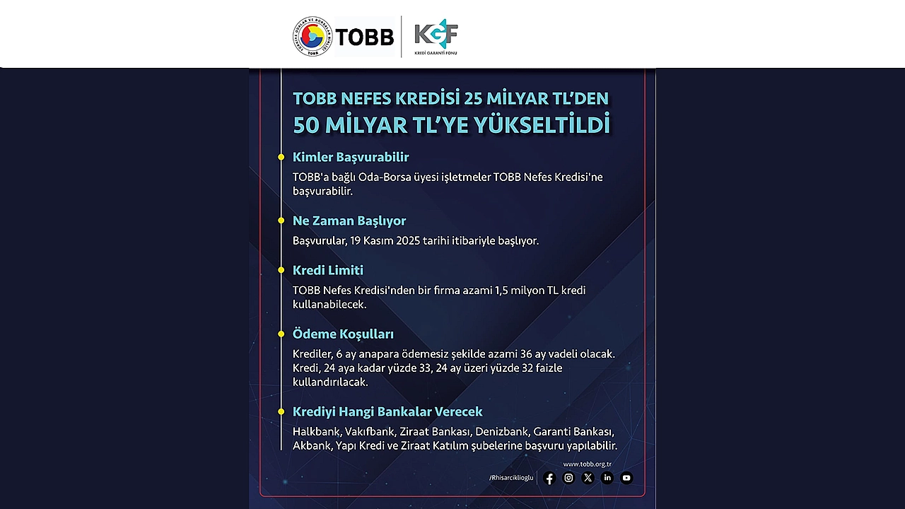 "Odamıza kayıtlı KOBİ üyelerimiz 2 Ekim 2025 tarihinden itibaren kredi başvurusu yapan Kobiler, Nefes Kredisi kapsamında bir firmanın azami 1,5 milyon TL’ye kadar kredi kullanabileceğini, kredi hacminin toplam büyüklüğü ise 25 milyar TL’den 50 milyar TL’ye yükseltildiği açıklandı.
