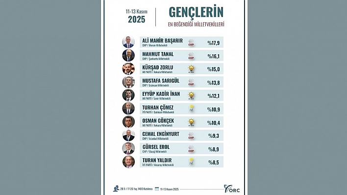 CHP Elazığ Milletvekili Gürsel Erol, ORC Araştırma'nın 11–13 Kasım 2025 tarihli 'Gençlerin En Beğendiği Milletvekilleri' anketinde %8,9 oranıyla ilk 10'da yer almasının ardından gençlere teşekkür eden bir açıklama yaptı.