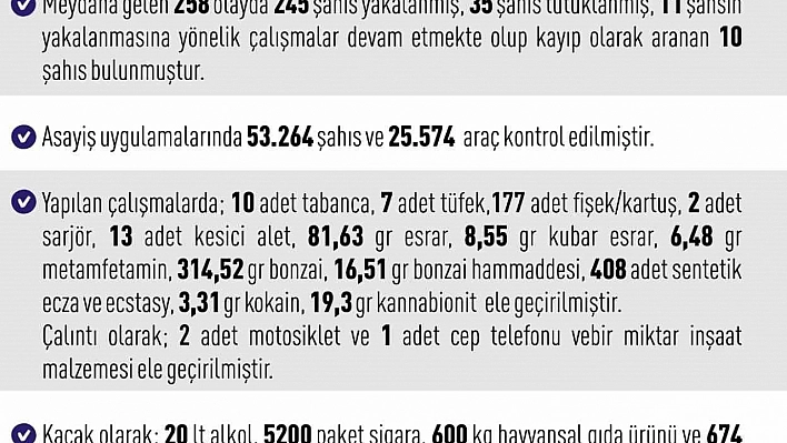 Yapılan çalışmalarda; 10 adet tabanca, 7 adet tüfek,177 adet fişek/kartuş, 2 adet sarjör, 13 adet kesici alet, 81,63 gram esrar, 8,55 gram kubar esrar, 6,48 gram metamfetamin, 314,52 gram bonzai, 16,51 gram bonzai hammaddesi, 408 adet sentetik ecza ve ecstasy, 3,31 gram kokain, 19,3 gram kannabionit, çalıntı olarak; 2 adet motosiklet ve 1 adet cep telefonu ve bir miktar inşaat malzemesi, kaçak olarak; 20 litre alkol, 5 bin 200 paket sigara, 600 killo hayvansal gıda ürünü ve 674 kilo balık ele geçirildiği bildirildi.