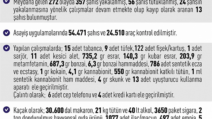 Yapılan çalışmalarda; 15 adet tabanca, 9 adet tüfek, 122 adet fişek/kartuş, 1 adet sarjör, 11 adet kesici alet, 735,2 gram esrar, 140,3 gram kubar esrar, 203,9 gram metamfetamin, 687,3 gram bonzai, 6,3 gram bonzai hammaddesi, 786 adet sentetik ecza ve ecstasy, 1 gram kokain, 4,1 gram kannabionit, 550 gram kannabionit katkılı tütün, 1 ml sentetik kannabionit ham maddesi, 4 gram skunk ve 13 adet uyuşturucu kullanma aparatı, çalıntı olarak; 6 adet cep telefonu ve 4 adet kredi kartı, kaçak olarak; 30 bin 600 dal makaron, 21 kilo tütün ve 40 litre alkol, 3650 paket sigara, 2 ton dondurulmuş hayvansal gıda ürünü, 1077 adet ilaç/macun, 497 adet empia, 5 adet muhtelif kazı malzemesi ve 1 adet dedektör ele geçirildiği bildirildi.