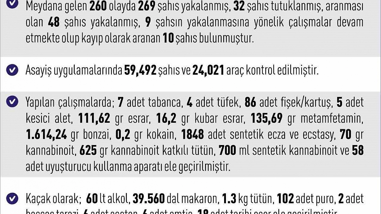 Kaçakçılıkla mücadele kapsamında ise 60 litre alkol, 39 bin 560 dal makaron, 1,3 kilogram tütün, 102 puro, 18 tarihi eser ve çeşitli malzemeler bulundu. Kent genelinde meydana gelen 31 trafik kazasında 53 kişi yaralanırken, denetimlerde 10 bin 10 araçtan 2 bin 692’sine cezai işlem uygulandı ve 232 araç trafikten men edildi.