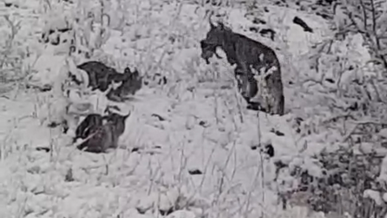 Elazığ’da avladığı kekliği yiyen vaşak ailesi kameralara yansıdı.