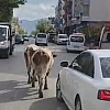 Elazığ'ın Karakoçan ilçesinde iki inek ilçe merkezine indi. Caddede gezen inekler sürücülere zor anlar yaşattı.