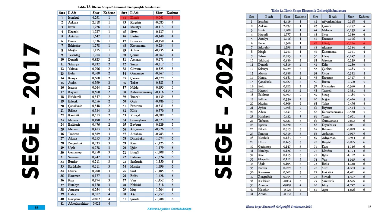 2017-SEGE Raporunda Dördüncü gelişmişlik kademesinde yer alan 14 il arasında 5.sırada yer alan Elazığ 2025-SEGE raporunda Dördüncü Kademe Gelişmişlik kademesinde yer alan 11 il arasında 9.sırada yer aldı.