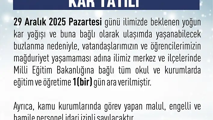 Elazığ Valiliği’nden yapılan açıklamada, "29 Aralık 2025 Pazartesi günü ilimizde beklenen yoğun kar yağışı ve buna bağlı olarak ulaşımda yaşanabilecek buzlanma nedeniyle, vatandaşlarımızın ve öğrencilerimizin mağduriyet yaşamaması adına ilimiz merkez ve ilçelerinde Milli Eğitim Bakanlığına bağlı tüm okul ve kurumlarda eğitim ve öğretime 1 gün ara verilmiştir. Ayrıca, kamu kurumlarında görev yapan malul, engelli ve hamile personel idari izinli sayılacaktır" denildi.