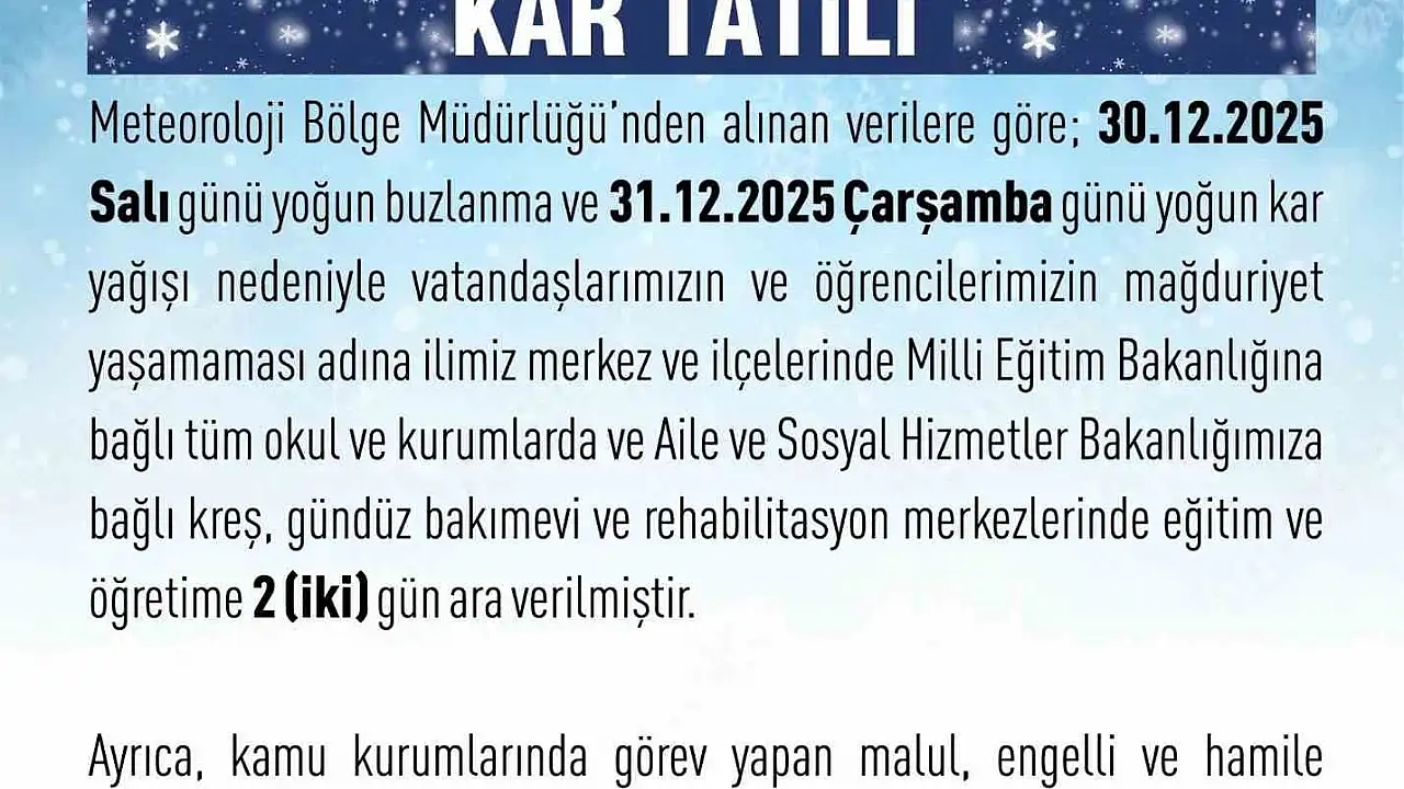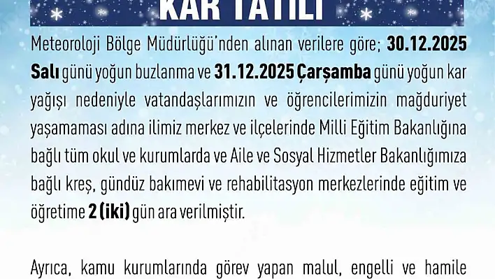 Elazığ Valiliği’nden yapılan açıklamada, "Meteoroloji Bölge Müdürlüğü’nden alınan verilere göre; 30.12.2025 Salı günü yoğun buzlanma ve 31.12.2025 Çarşamba günü yoğun kar yağışı nedeniyle vatandaşlarımızın ve öğrencilerimizin mağduriyet yaşamaması adına ilimiz merkez ve ilçelerinde Milli Eğitim Bakanlığına bağlı tüm okul ve kurumlarda ve Aile ve Sosyal Hizmetler Bakanlığımıza bağlı kreş, gündüz bakımevi ve rehabilitasyon merkezlerinde eğitim ve öğretime 2 (iki) gün ara verilmiştir. Ayrıca, kamu kurumlarında görev yapan malul, engelli ve hamile personel idari izinli sayılacaktır" denildi.