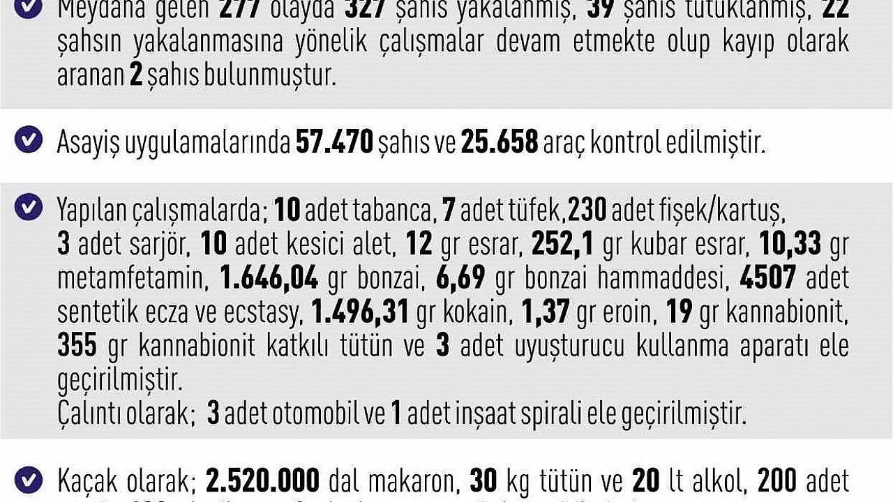 Narkotik suçlarla mücadele ve kaçakçılığın önlenmesine yönelik operasyonlarda ise yüklü miktarda suç unsuru ele geçirildi. Yapılan aramalarda, kilogram bazında uyuşturucu maddeler ve piyasaya sürülmeye hazır milyonlarca kaçak makaronun emniyet birimleri tarafından muhafaza altına alındığı bildirildi.