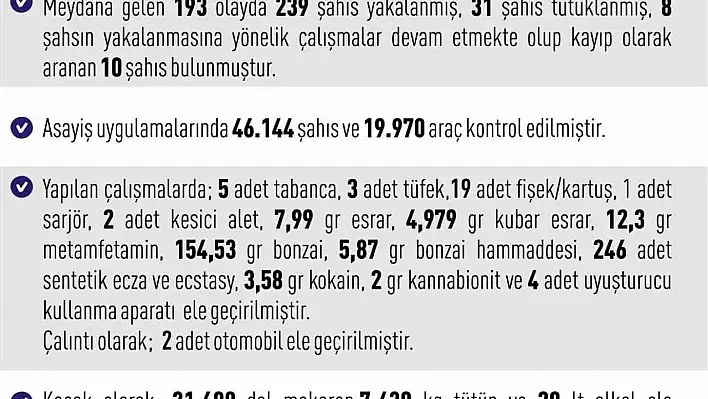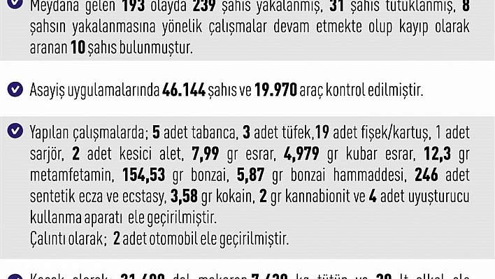 Yapılan çalışmalarda; 5 adet tabanca, 3 adet tüfek, 19 adet fişek/kartuş, 1 adet sarjör, 2 adet kesici alet, 7,99 gram esrar, 4,979 gram kubar esrar, 12,3 gram metamfetamin, 154,53 gram bonzai, 5,87 gram bonzai hammaddesi, 246 adet sentetik ecza ve ecstasy, 3,58 gram kokain, 2 gram kannabionit ve 4 adet uyuşturucu kullanma aparatı, çalıntı olarak 2 adet otomobil, kaçak olarak ise 21 bin 600 dal makaron, 7 bin 430 kilo tütün ve 20 litre alkol ele geçirildiği bildirildi.