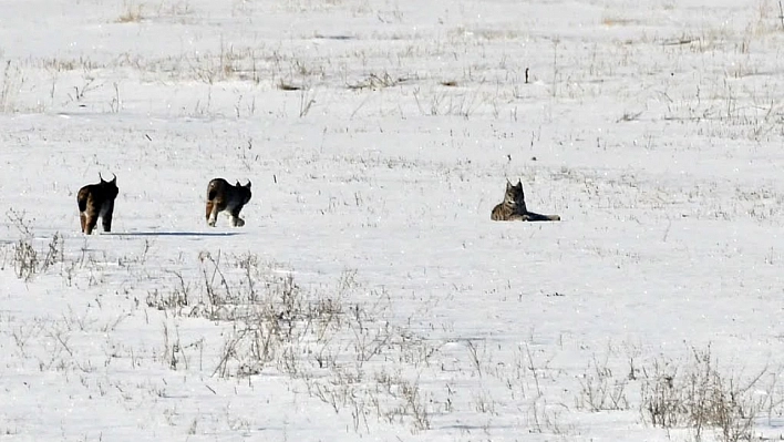 Bölgede etkili olan kar yağışı sonrası doğada yiyecek bulmakta zorlanan vaşak ailesinin köy kırsalına kadar indiği görüldü. Bir süre kar üzerinde ilerleyen vaşaklar, daha sonra gözden kayboldu.