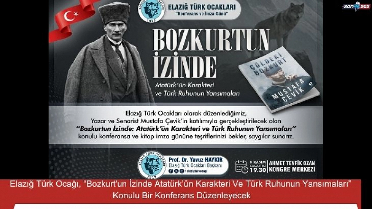 Elazığ Türk Ocağı düzenli aralıklarla tertip ettiği etkinliklerine bir yenisiyle daha devam ediyor. Bu amaçla konuşmacı olarak Yazar Senarist Mustafa Çevik’in katılacağı “Bozkurt'un İzinde-Atatürk’ün Karakteri ve Türk Ruhunun Yansımaları” isimli bir konferans düzenlenecek. Gazi Mustafa Kemal Atatürk’ün biyografik olarak ele alınacağı konferans 08 Kasım 2025 tarihinde Ahmet Tevfik Ozan Kültür ve Kongre Merkezinde saat 19:30’da başlayacak.