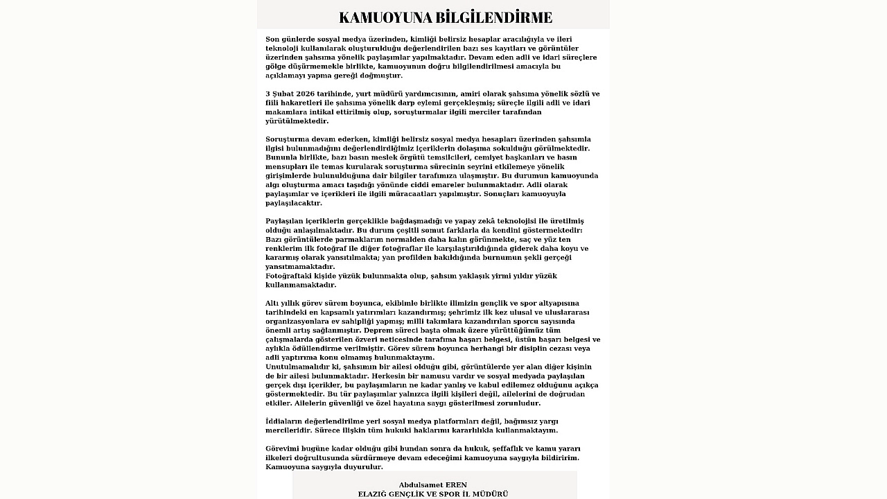 Elazığ Gençlik ve Spor İl Müdürü Abdulsamet Eren, son günlerde sosyal medya üzerinden şahsına yönelik yürütülen karalama kampanyası ve paylaşılan ses/görüntü kayıtlarına ilişkin yazılı bir basın açıklaması yaptı. Eren, 3 Şubat'ta yaşadığı darp olayını hatırlatarak, servis edilen içeriklerin yapay zeka ile üretildiğini ve süreci manipüle etmeyi amaçladığını belirtti.