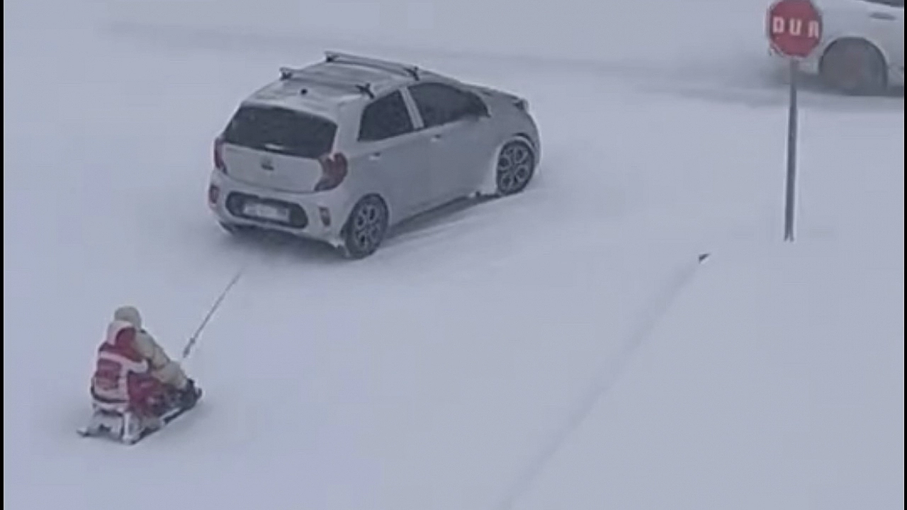 Elazığ'da karda eğlenmeye çalışan şahıslar kızağı araca bağlayıp çekti. Tehlikeli eğlence kameralara yansıdı.