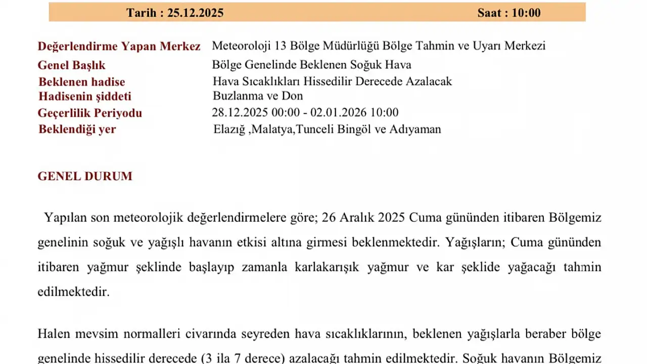 Meteoroloji 13. Bölge Müdürlüğü’nden yapılan uyarıda, "Yapılan son meteorolojik değerlendirmelere göre; 26 Aralık 2025 Cuma gününden itibaren Bölgemiz genelinin soğuk ve yağışlı havanın etkisi altına girmesi beklenmektedir. Yağışların; Cuma gününden itibaren yağmur şeklinde başlayıp zamanla karlakarışık yağmur ve kar şeklide yağacağı tahmin edilmektedir. Halen mevsim normalleri civarında seyreden hava sıcaklıklarının, beklenen yağışlarla beraber bölge genelinde hissedilir derecede (3 ila 7 derece) azalacağı tahmin edilmektedir. Soğuk havanın Bölgemiz genelinde önümüzdeki hafta boyunca da etkisini sürdürmesi beklenmektedir. Bu süreçte; özellikle gece ve sabah saatlerinde sıcaklıkların düşmesine bağlı olarak buzlanma ve don olaylarının görülebileceği, buna bağlı olarak kara, hava ve deniz ulaşımında aksamalar yaşanabileceği değerlendirilmektedir. Ayrıca, tarımsal faaliyetlerin devam ettiği bölgelerde soğuk hava ve don olaylarının zirai don riskini artıracağı, ürün kayıplarına neden olabileceği öngörülmektedir. Çevre, Şehircilik ve İklim Değişikliği Bakanlığı Meteoroloji Genel Müdürlüğü tarafından hazırlanıp yayınlanacak olan tahmin ve meteorolojik erken uyarıların takip edilmesi önem arz etmektedir" denildi.