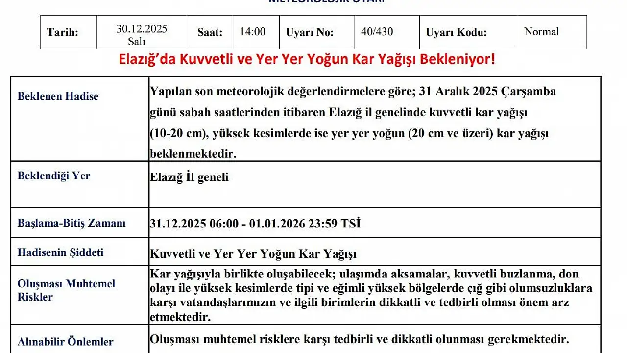 Meteoroloji 13. Bölge Müdürlüğü’nden yapılan açıklamada, "Yapılan son meteorolojik değerlendirmelere göre; 31 Aralık 2025 Çarşamba günü sabah saatlerinden itibaren Elazığ il genelinde kuvvetli kar yağışı (10-20 cm), yüksek kesimlerde ise yer yer yoğun (20 cm ve üzeri) kar yağışı beklenmektedir. Kar yağışıyla birlikte oluşabilecek; ulaşımda aksamalar, kuvvetli buzlanma, don olayı ile yüksek kesimlerde tipi ve eğimli yüksek bölgelerde çığ gibi olumsuzluklara karşı vatandaşlarımızın ve ilgili birimlerin dikkatli ve tedbirli olması önem arz etmektedir" denildi.