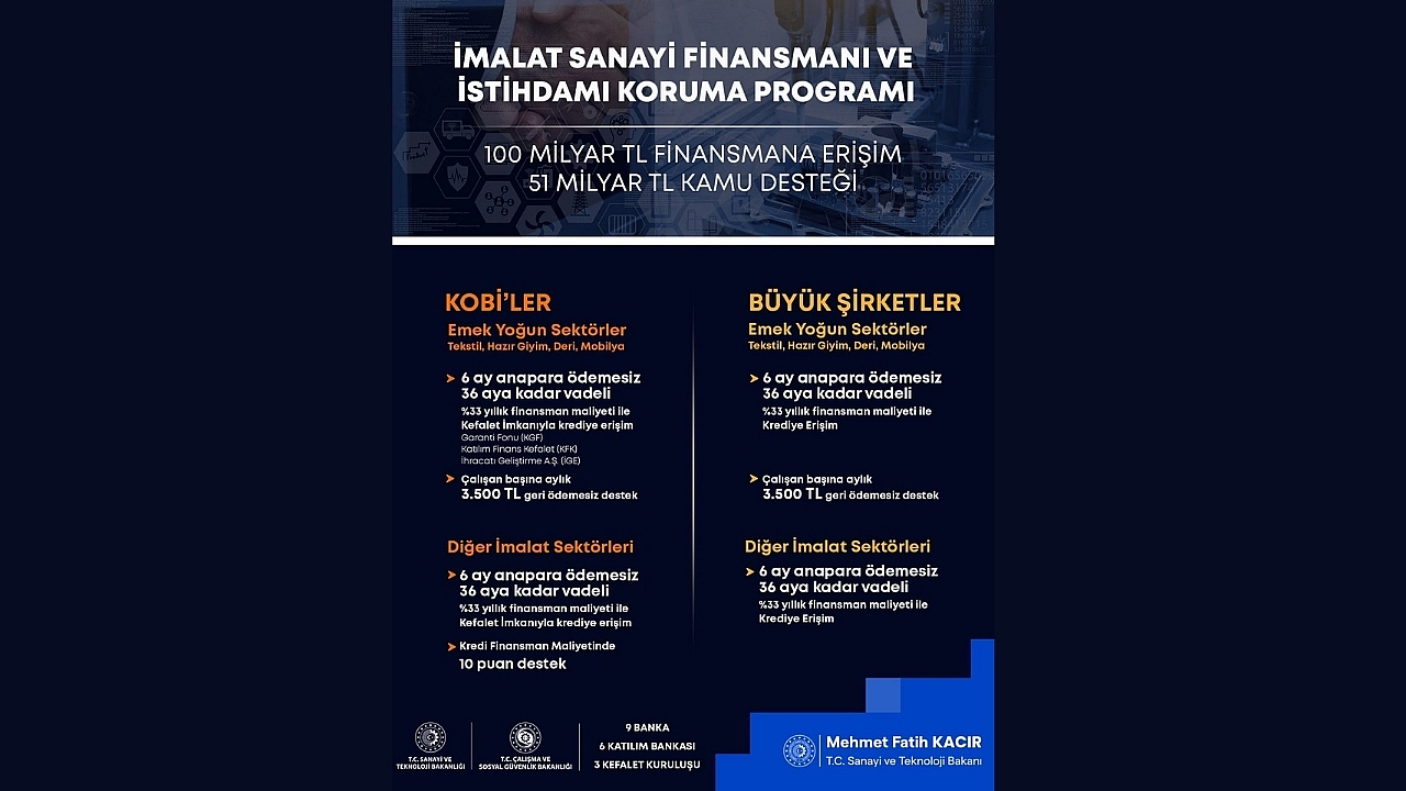 Sanayi ve Teknoloji Bakanı Mehmet Fatih Kacır, imalat sanayine yönelik 100 milyar lira büyüklüğünde yeni bir finansman programını kamuoyuna açıkladı.
